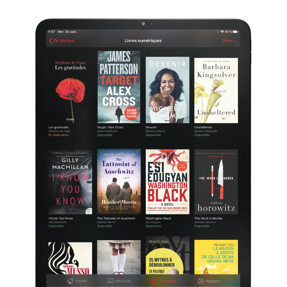 • Catalogues disponibles grâce au support OPDS 1.x/2.0 ainsi qu'au registre des bibliothèques